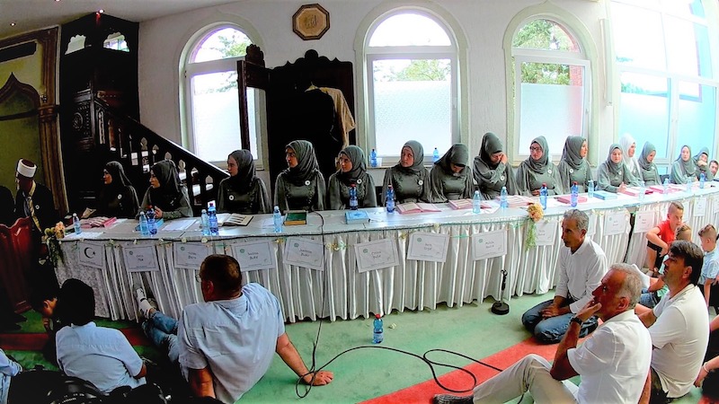 Na ulaznim vratima pojavljuju se muallimi Dževad ef. Isaković  i Mustafa ef. Klanco a iza njih devet mladića i petnaest djevojaka uz  tiho  učenje tekbira ulaze njih 24. Posebno su obučeni, svečano. Muški u  odjelima a djevojke u posebno sašivenim haljinama: