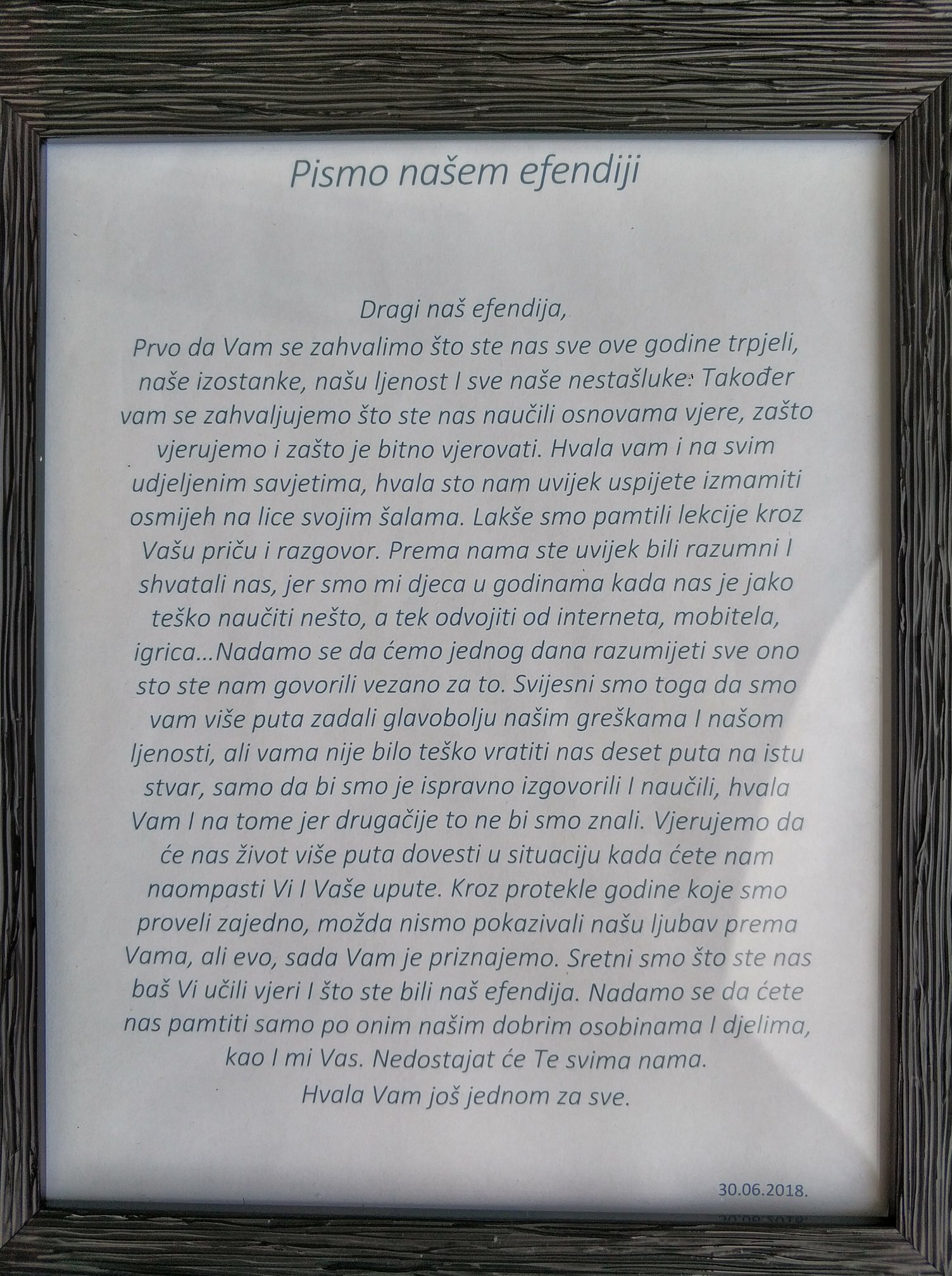 Spomenimo i to da su djeca na ovim hatmama, po jedinstvenoj procjeni prisutnih imama, pokazala izuzetan kvalitet u učenju Kur'ana, što je dodatni dokaz u prilog kvaliteta onoga ko ih je Kur'anu podučavao. Da to jučerašnji slavljenici znaju cijeniti, pokazali su i jedom prelijepom gestom. Pored poklona svome muallimu za uloženi trud u njihovom odgoju i podučavanju, pročitali su mu pismo zahvale, koje su mu uokvirili i uručili, sa molbom da ga čuva kako bi ga sjećalo na lijepe dane...