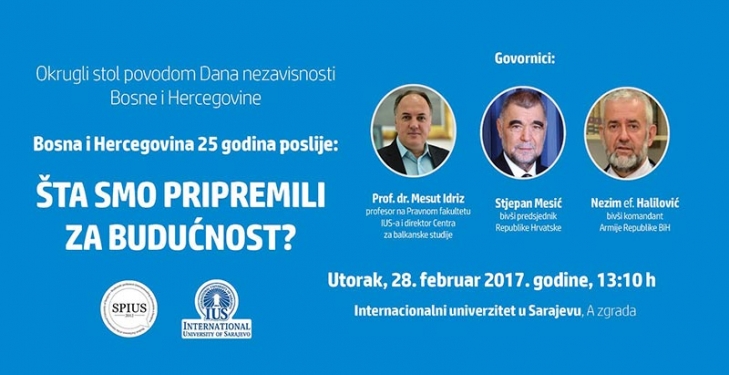 Studentski parlament Internacionalnog univerziteta u Sarajevu (SPIUS) organizuje okrugli stol povodom Dana nezavisnosti Bosne i Hercegovine u utorak, 28. februara 2017. godine, 13:00 h, IUS, A zgrada. Tema okruglog stola je Bosna i Hercegovina 25 godina poslije: Šta smo pripremili za budućnost?